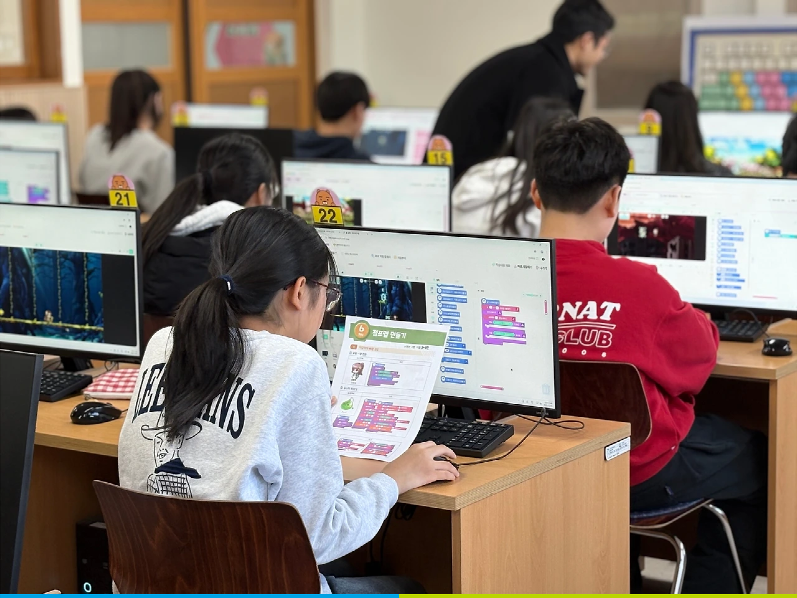 코딩 선생님이 된 대학생들은 헬로메이플을 활용해 어떻게 수업을 진행하고 있을까? 서울대학교 학생들이 멘토로 활동 중인 서울 신길초등학교와 물댄동산 난곡지역아동센터를 찾았다. 신길초등학교에는 김다희, 김민재, 송동호, 송민혁, 오인경, 황지연 멘토가 그동안 학습한 다양한 기능의 블록들로 ‘랜덤 과일 게임’을 제작해 보는 실습을 하고 있었으며, 물댄동산 난곡지역아동센터에서는 강신의, 이유정, 정세연, 지수민 멘토가 멘티들이 '나만의 월드'를 직접 기획하고 제작할 수 있도록 돕고 있었다.