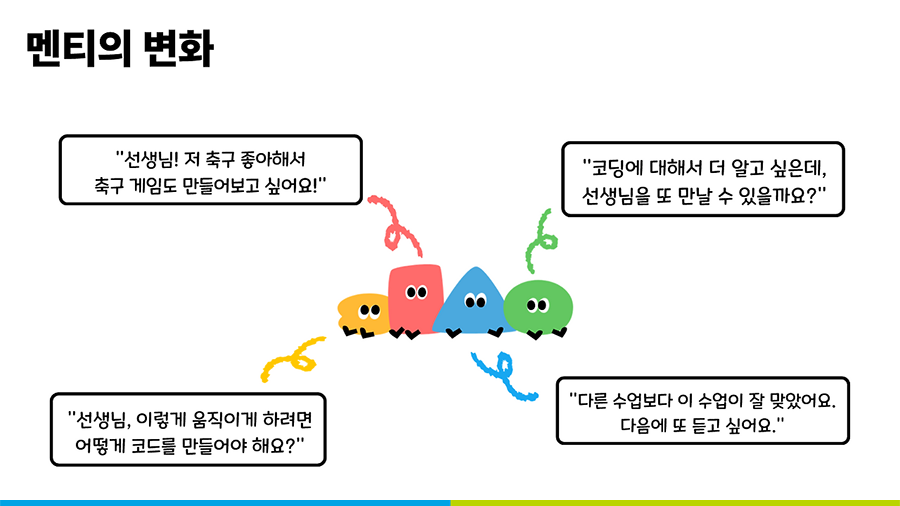 원래 교사의 꿈을 꾸진 않았다는 사범대생 멘토는 "마지막 수업이 끝나고 멘티들이 직접 쓴 편지를 전해주고 눈물을 보였을 때가 가장 기억에 남아요. 그동안 함께한 시간이 정말 뜻깊었고 그만큼 아쉬웠습니다. 교사의 꿈을 꾸지 않았었는데 교육 쪽에 관심을 갖게 되었습니다.”라며 변화를 이야기했고, “개발 쪽에 관심이 있었는데, 멘티들과 코딩 수업을 진행하며 ‘헬로메이플’처럼 학생들이 재미있게 코딩을 배울 수 있는 방법이나 도구들을 개발해 보고 싶다는 목표를 갖게 되었습니다."라고 말하는 공대생 멘토의 이야기도 인상적이었다.